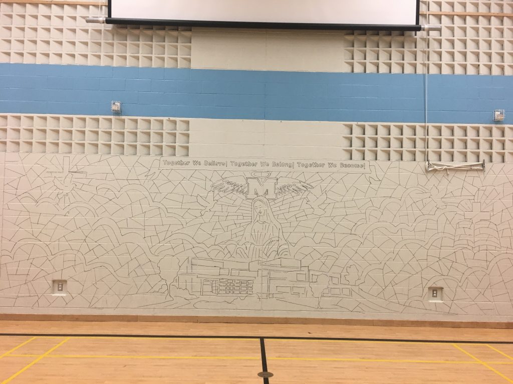 What started as a blank white wall has been transformed. Mr. Koci designed and started the sketch of what soon would become a beautiful mural dedication to Mother Mary.